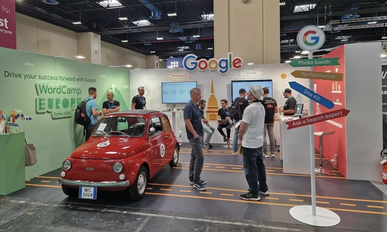 The bright, white booth features clear, inviting signage that draws attendees in, with a prominent help desk area encouraging meaningful connections between Googlers and the WordPress community. This flexible visual system translated seamlessly across all trade show materials, ensuring a consistent, cohesive brand experience throughout the event.